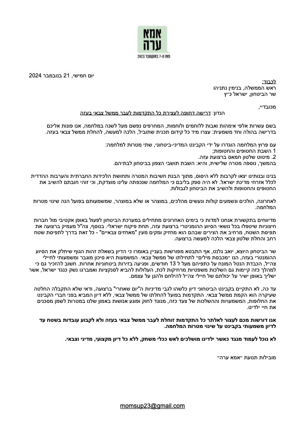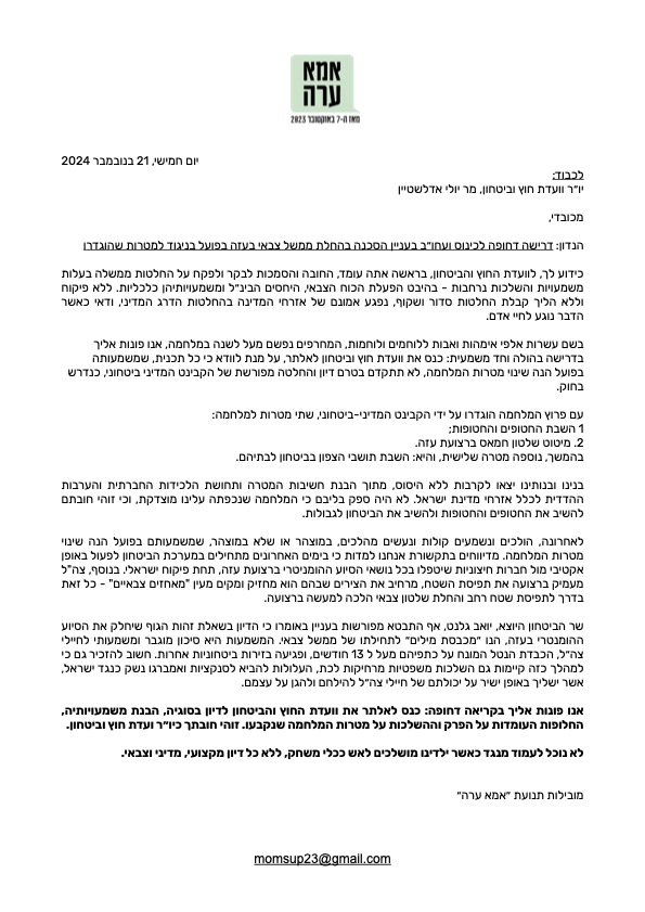 עם התגברות הדיווחים והקולות אודות התקדמות בפועל להחלת ממשל צבאי בעזה, ללא כל דיון או החלטה רשמית במסגרת הליך קבלת החלטות תקין, פנינו בפניה דחופה לרוה״מ ושר הביטחון. בפנייתנו דרשנו מהם לעצור את המהלכים הללו, אשר מסכנים את חיי ילדינו ואינם עולים בקנה אחד עם מטרות המלחמה.